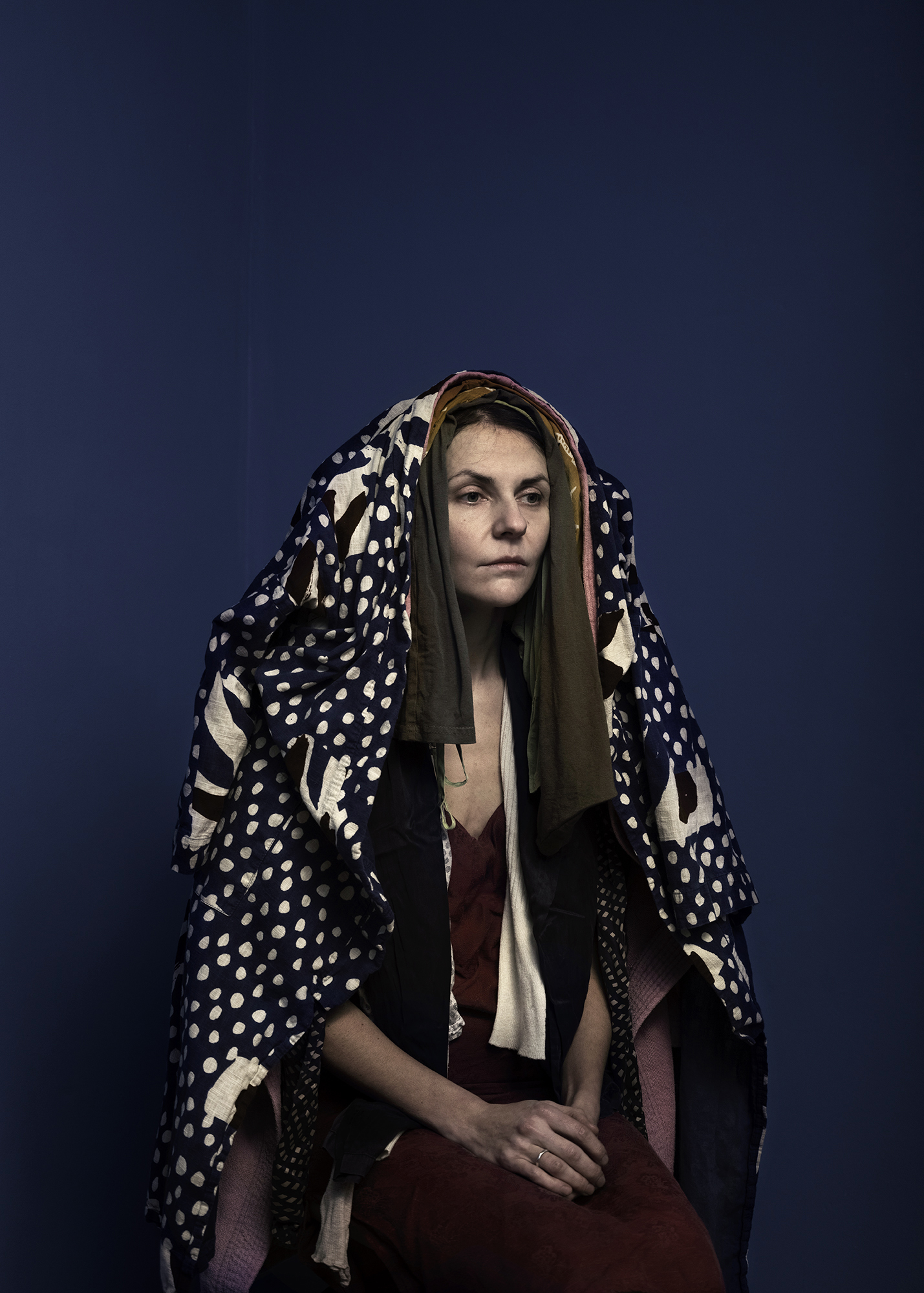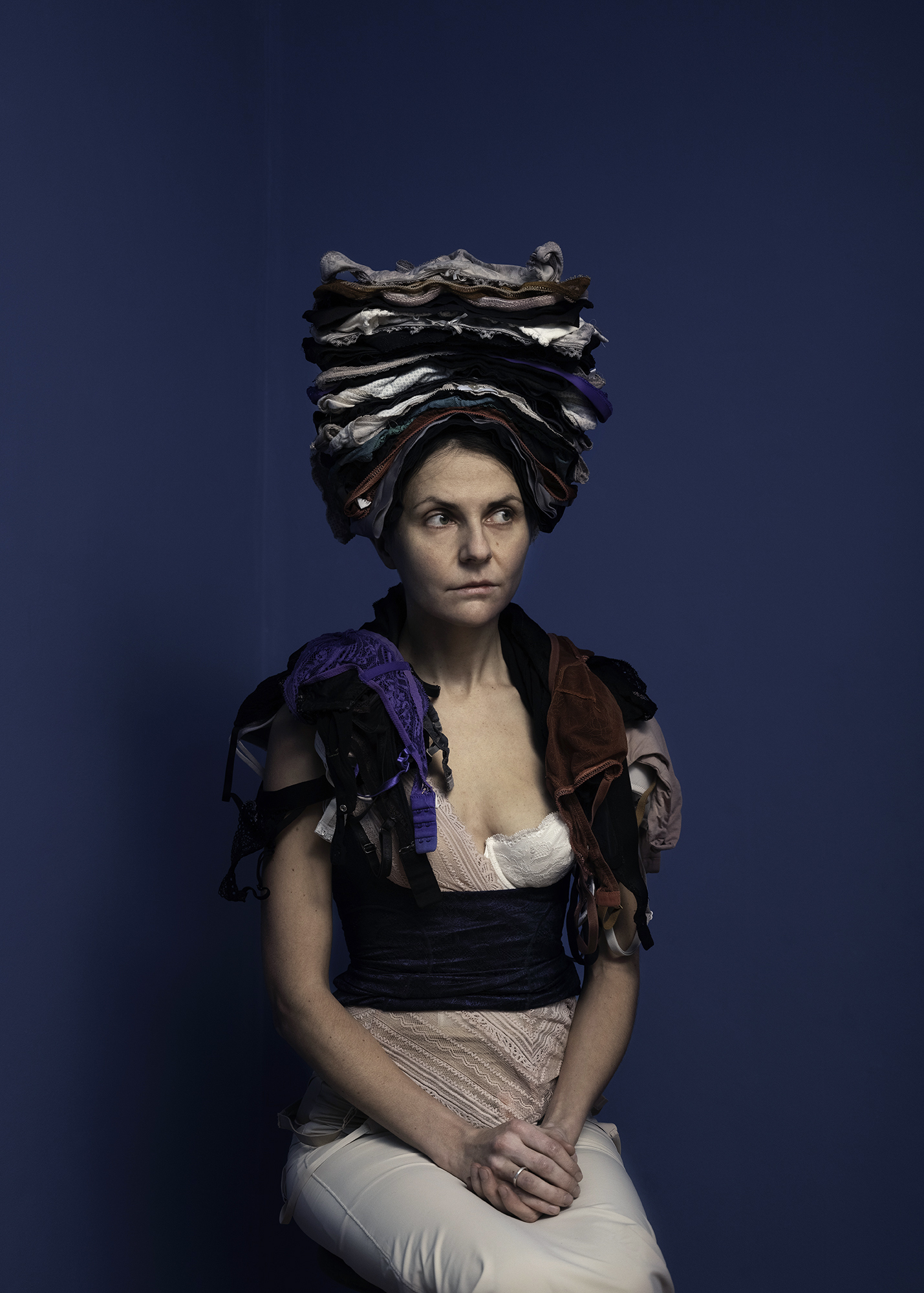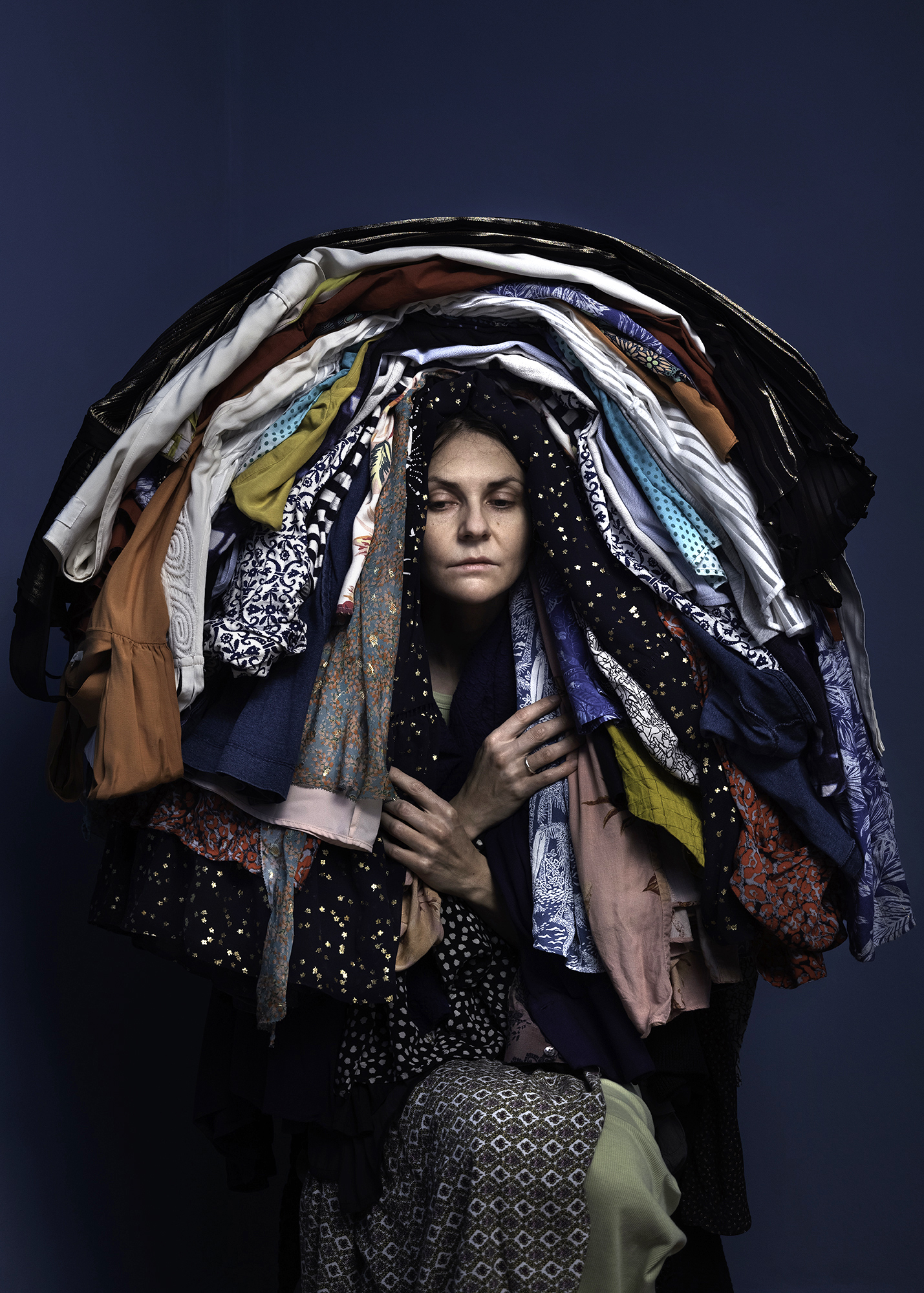 Diese Serie ist mein Geständnis. Auf jedem Bild trage ich alle Kleidungsstücke, die ich besitze, aus einer Kategorie: alle meine Kleider, Nachtwäsche, Unterwäsche, ... Forscher haben herausgefunden, dass eine „ausreichende“ Garderobe aus 74 Kleidungs stücken besteht. Mit meiner Garderobe liege ich weit darüber, obwohl ich weniger und Second Hand kaufe, Qualität der schnellen Mode vorziehe, recycle und repariere. Trotzdem spüre ich jeden Tag das mentale Gewicht meiner Kleidung. Es kommt von dem Bewusstsein, dass ich ein Teil des globalen Problems der nicht nachhaltigen Mode bin.