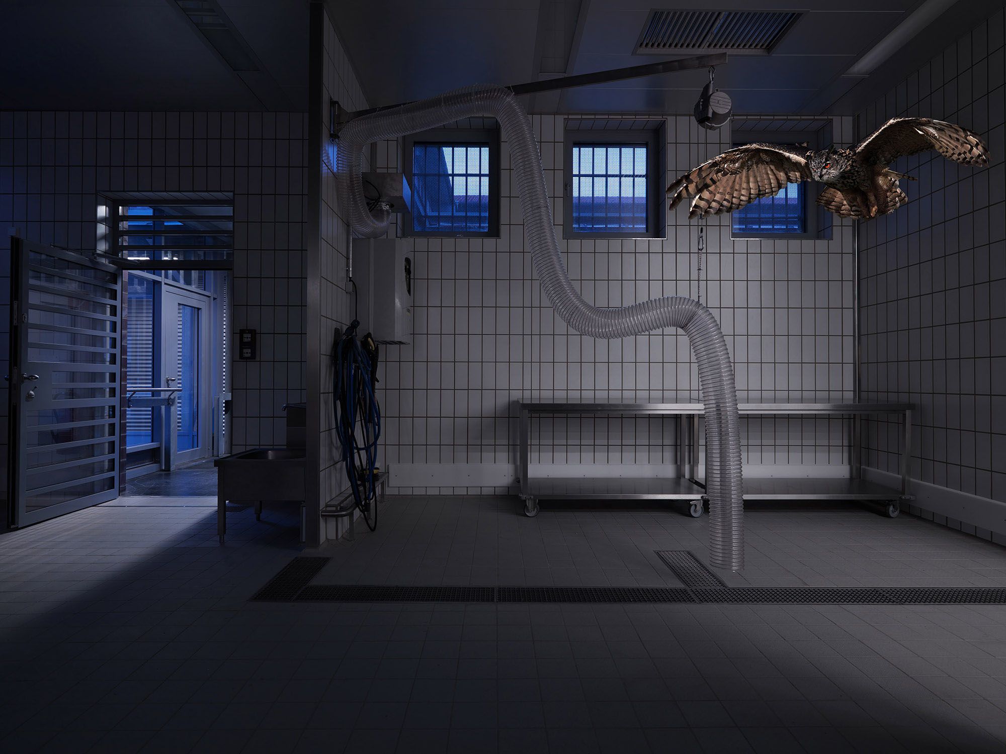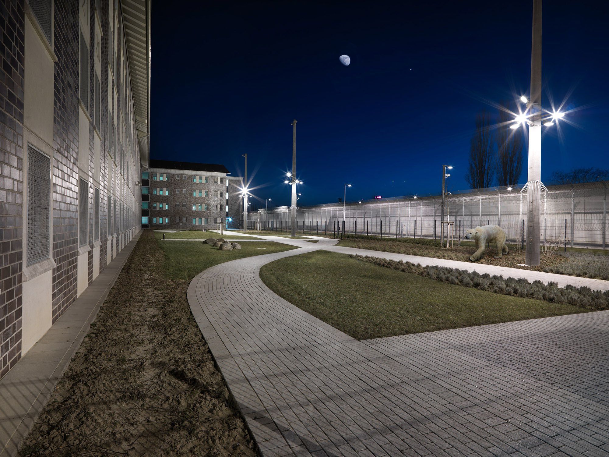 Mes photos du nouveau centre pénitentiaire de Düsseldorf m’ont fourni un scénario dystopique. Avec le début de la pandémie, lorsque les gens disparaissent des rues et des places et qu’un vide fantomatique devient palpable, je ressors ces travaux. Elles me semblent être un reflet prématuré du lockdown. J’intègre des animaux par traitement d’image. Réaliste, mais pas vraiment possible, n’est-ce pas ? L’absence d’humains devient encore plus évidente.