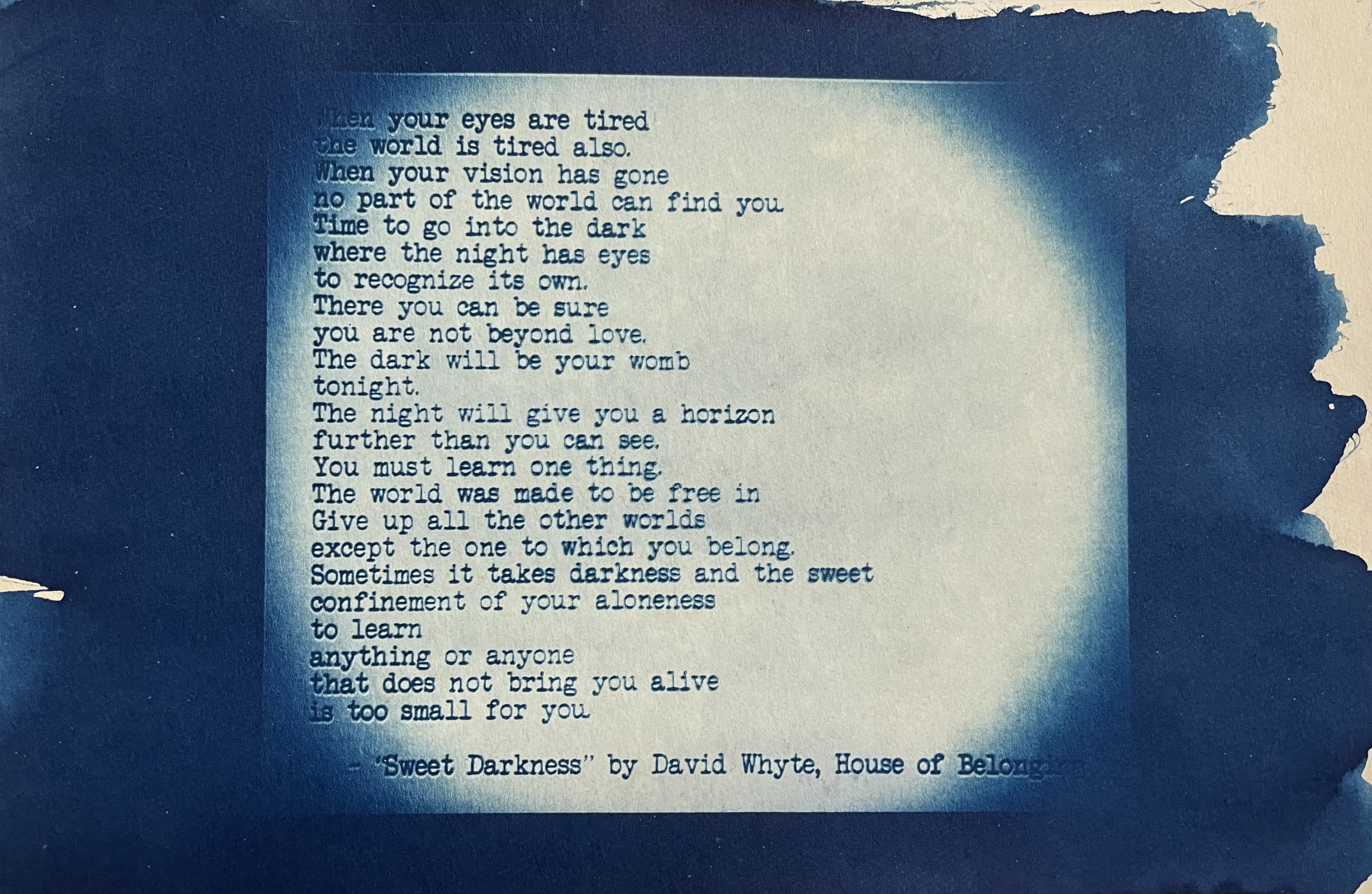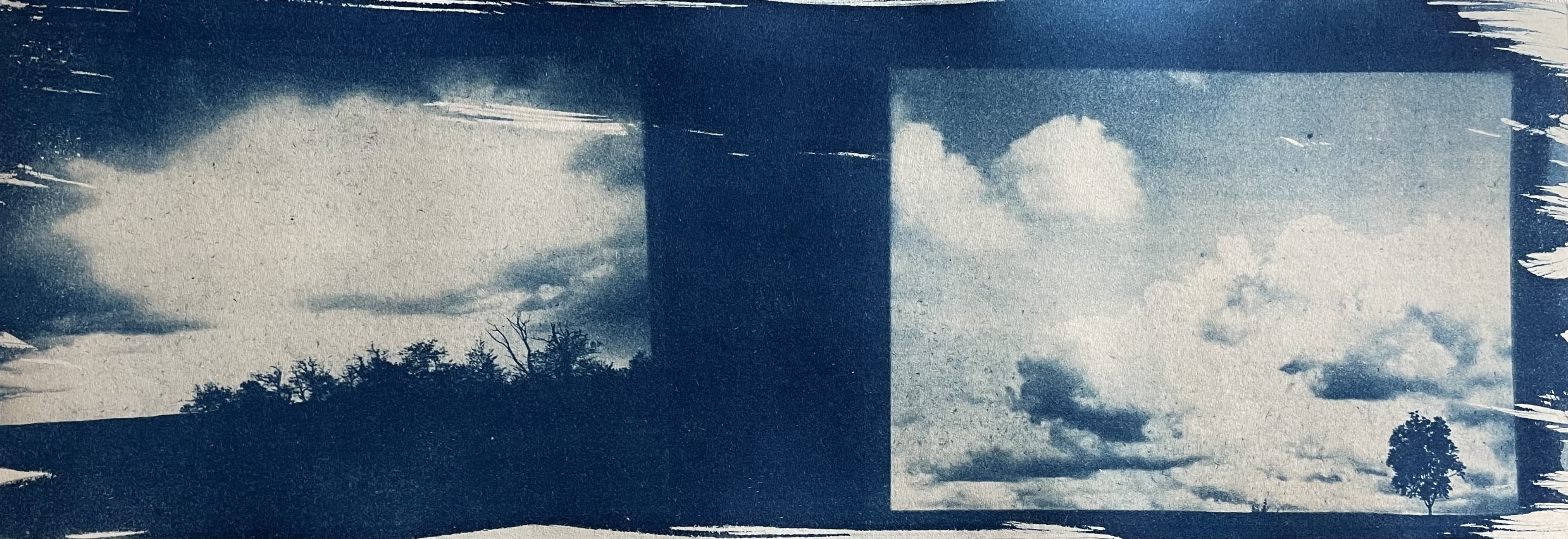 J’aime les cyanotypes pour leurs couleurs bleues et blanches, qui apportent une ambiance poétique. Le titre de ma série fait référence à un recueil de poèmes de David Whyte, dont est extrait le poème Sweet Darkness. Depuis le suicide d’une amie, les mots de Whyte me relient à elle. Lorsque je me promène dans des paysages que j’ai traversés avec elle, des images me parviennent, je voyage vers elle, je m’immerge dans l’immensité, j’interroge les nuages et le vent.